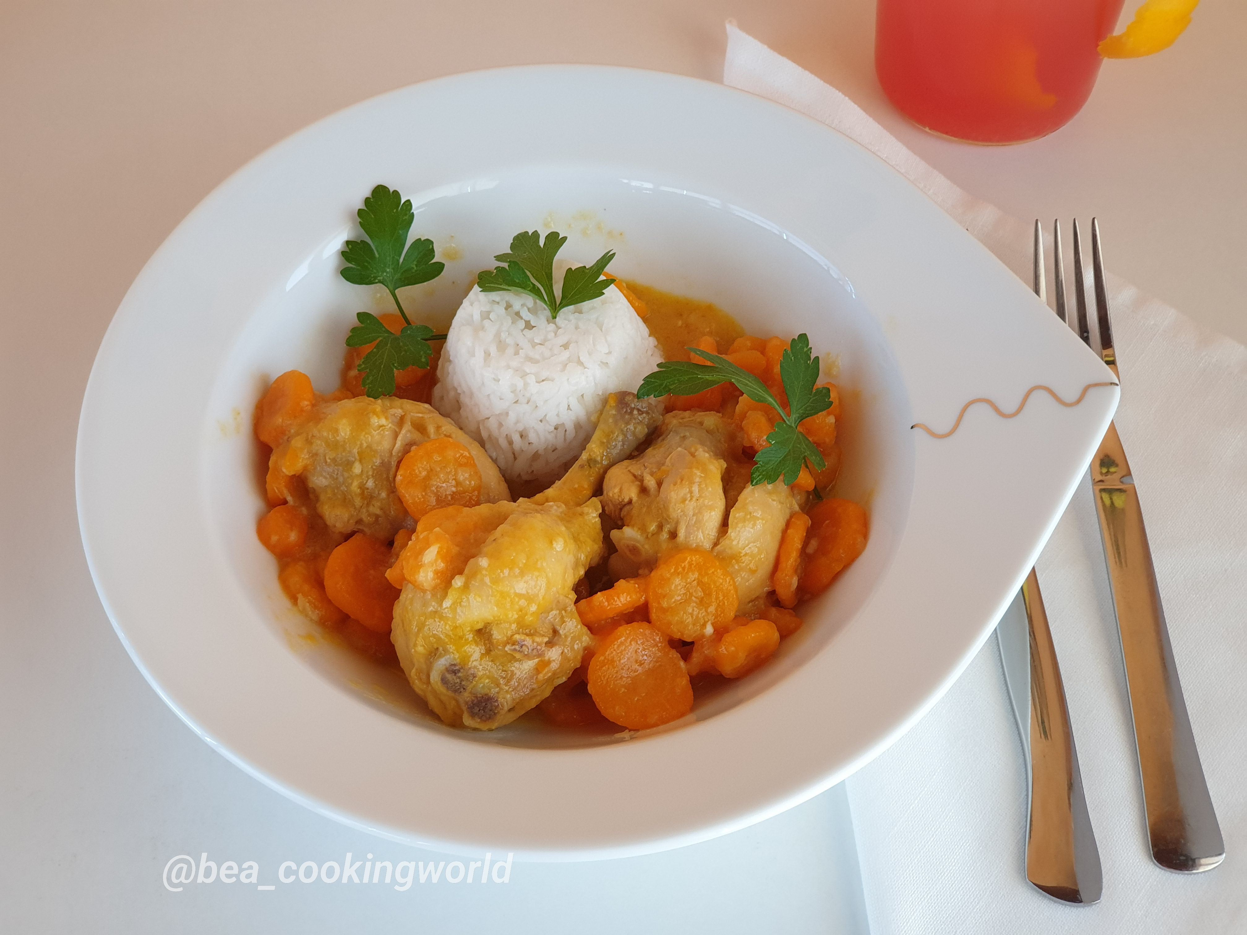 3 Agregue los muslos de pollo, el vino y el agua y programe 30 min/Varoma/ giro inverso habilitado/vel cuchara. Vierta el contenido del vaso en una fuente y sirva.