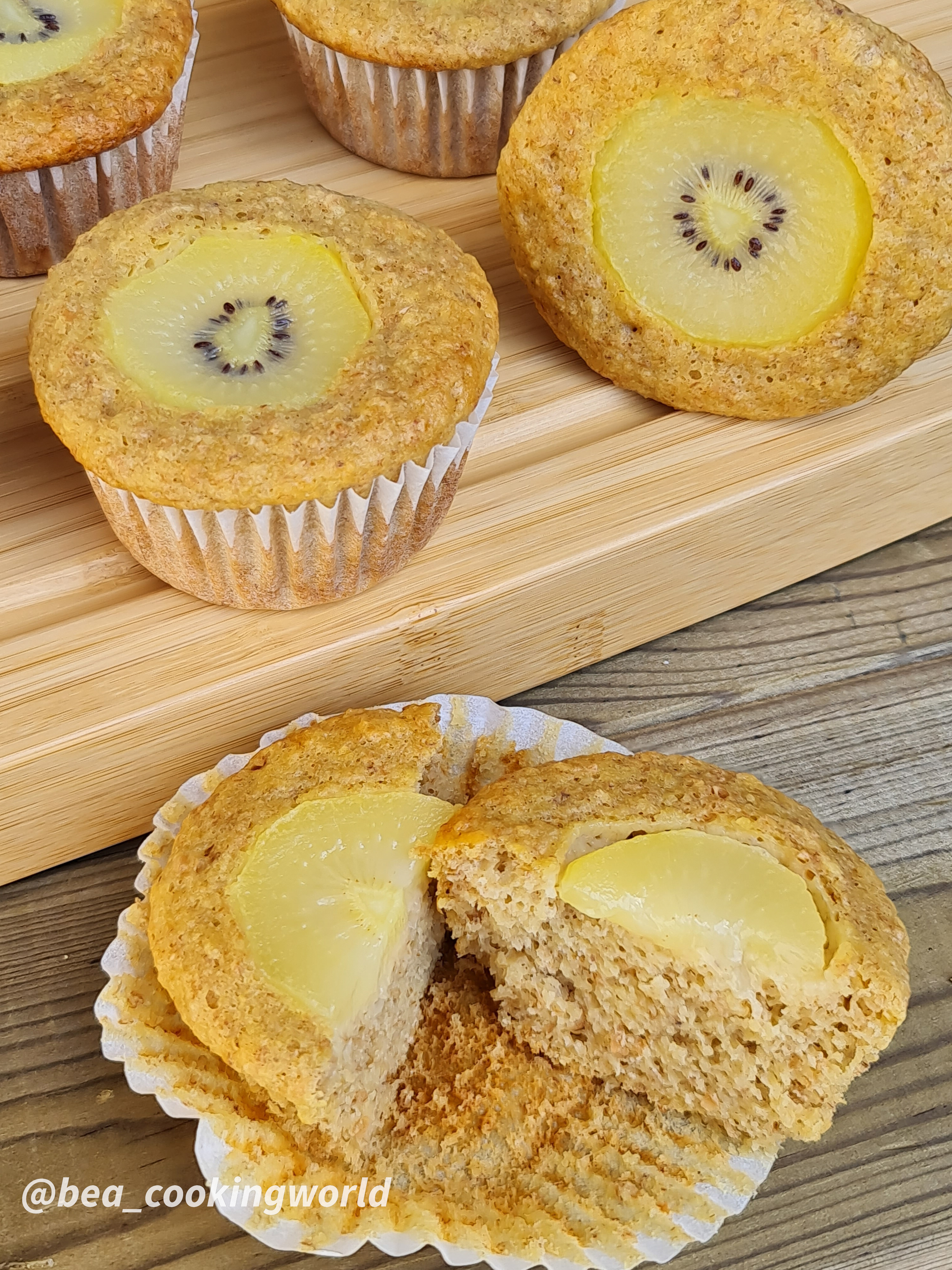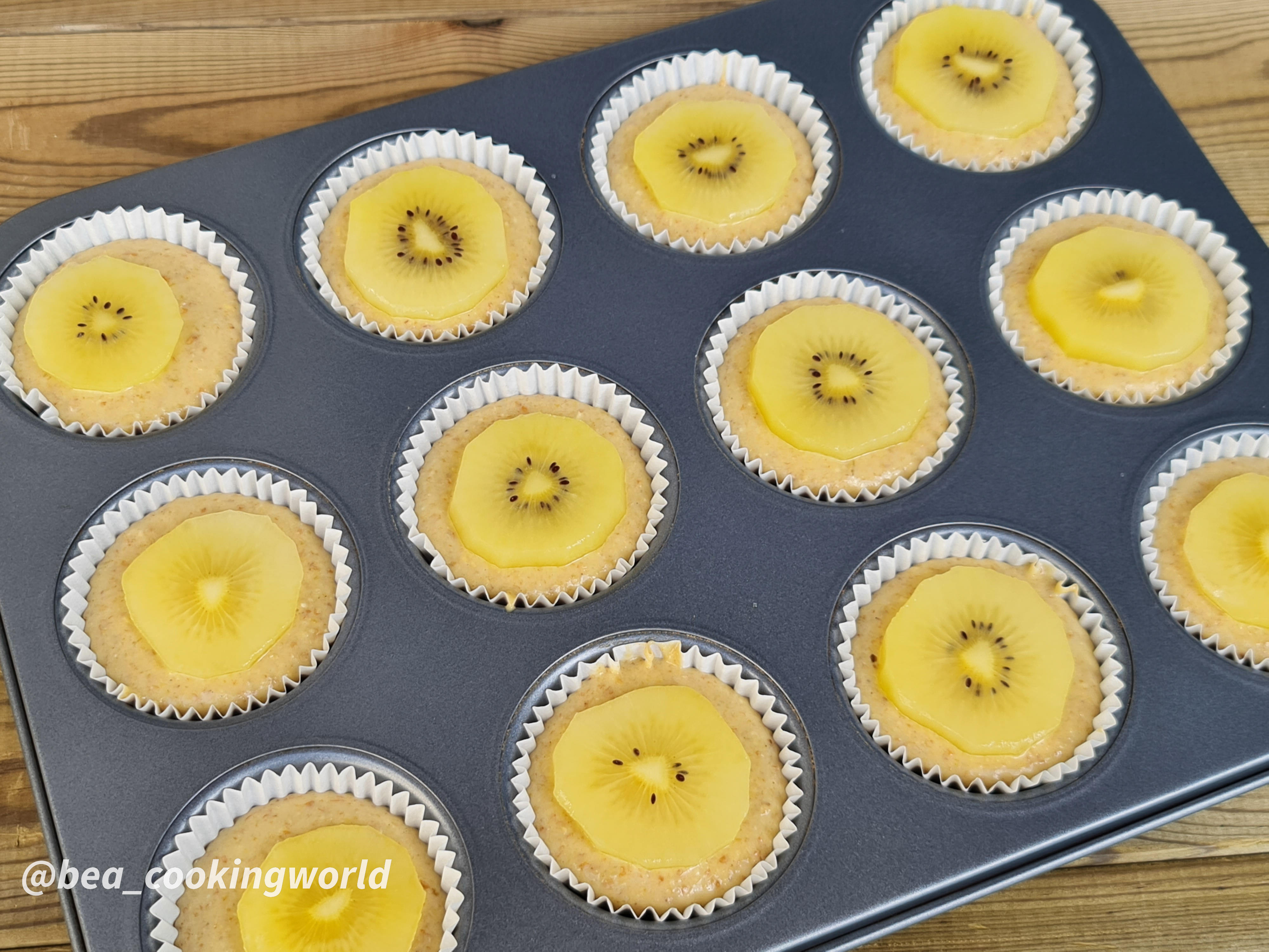 1 Precaliente el horno a 180°C. Coloque 12 cápsulas de papel en los huecos de un molde para 12 magdalenas y reserve. Pele 2 kiwis, córtelos en rodajas de 5 mm y reserve.
