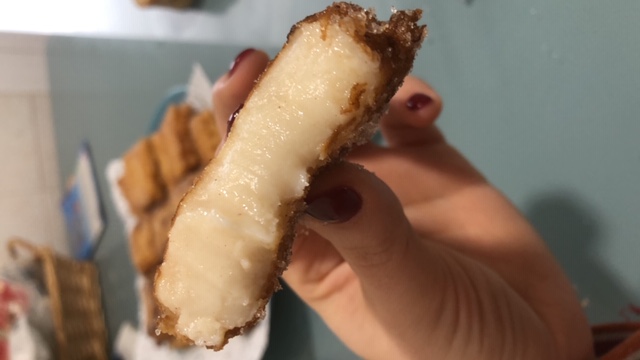 Corte la crema fría en 24 porciones, páselas por harina (los 100 g restantes) y huevo batido y fríalas en abundante aceite caliente. Rebócelas en una mezcla de 100 g de azúcar y 1 cucharadita de canela y sirva.
