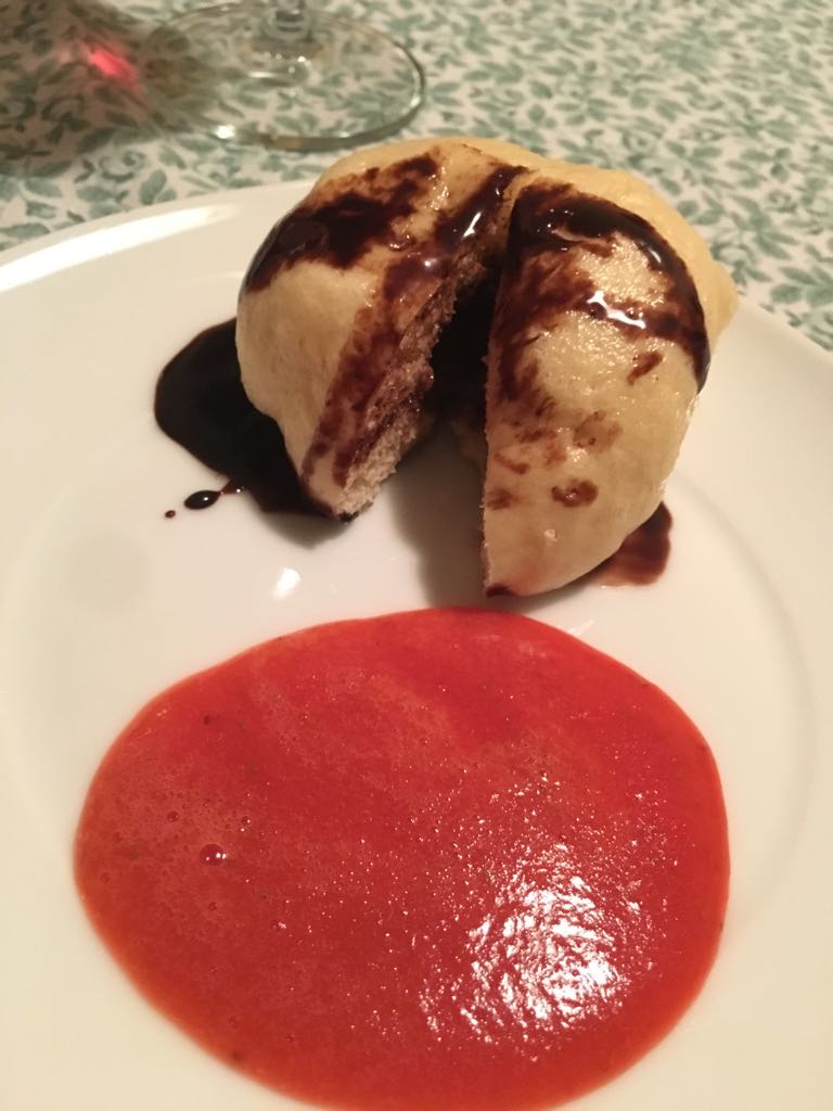 Bollos al vapor rellenos de chocolate y con salsa de fresas
